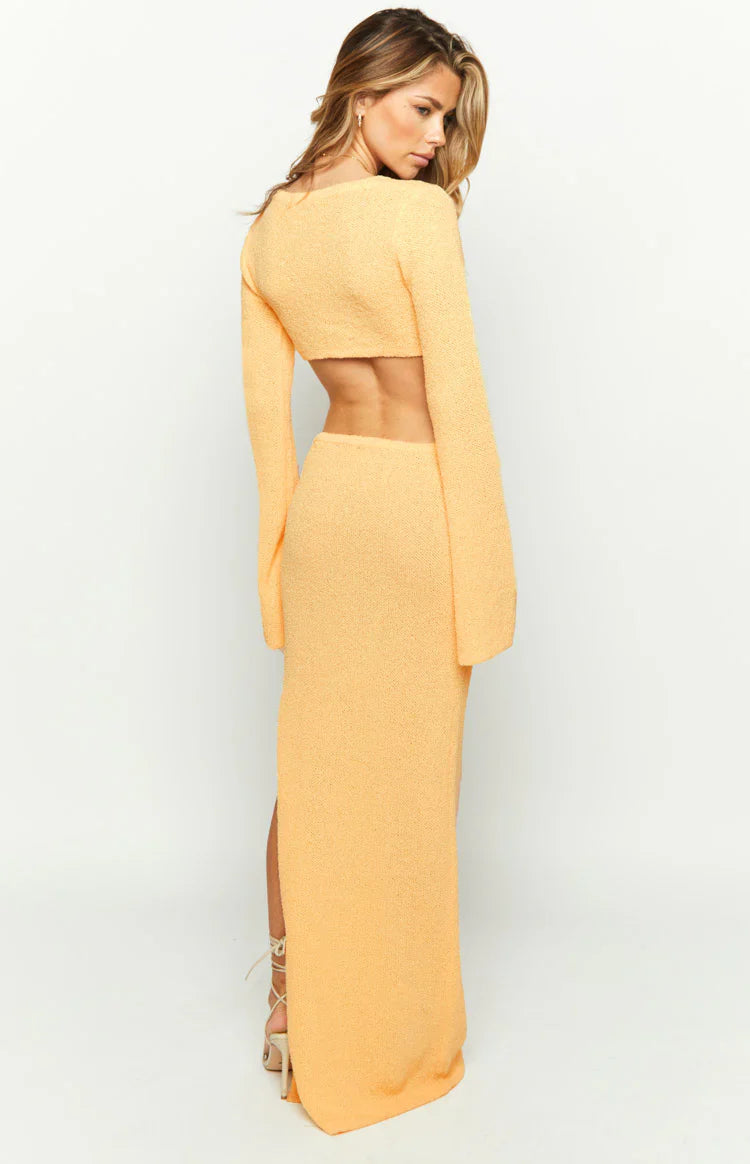 • Statement features: With its waist and back cut out, flared sleeves, and side leg split.
