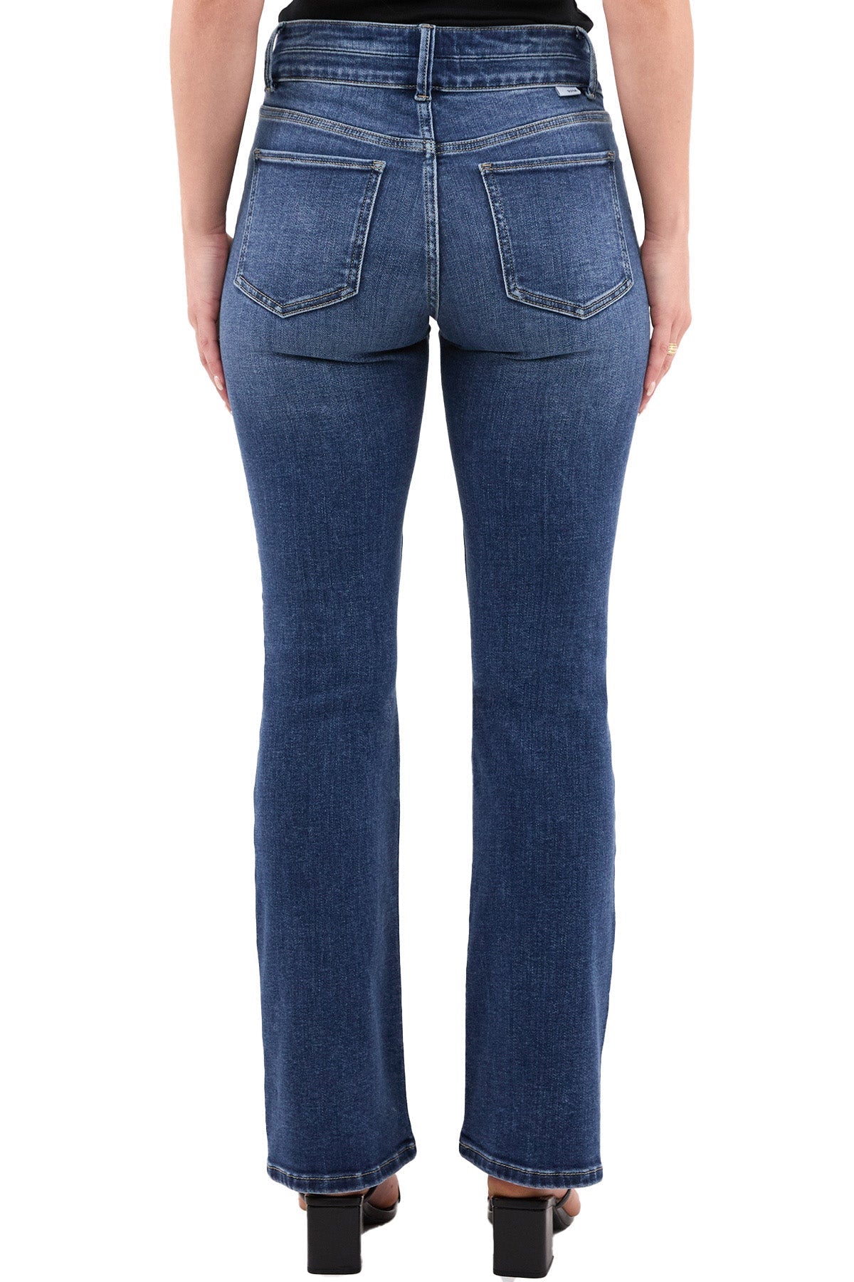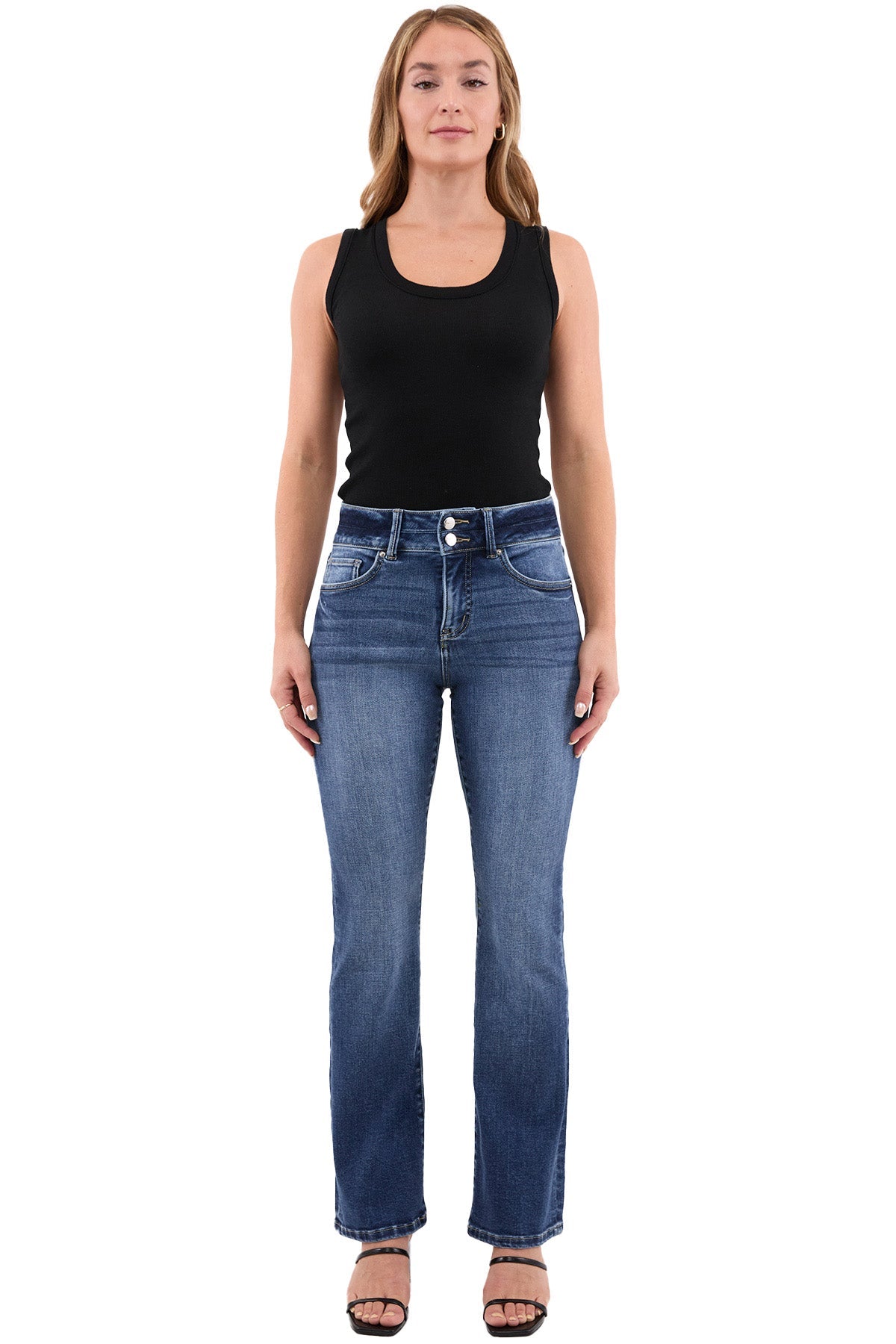 Mia High Rise 2-Button Bootcut Jeans, designed for the woman who values both comfort and timeless fashion. These jeans feature a flattering high-rise fit that accentuates your waist, while the bootcut leg offers a classic silhouette that works perfectly with everything from heels to boots.